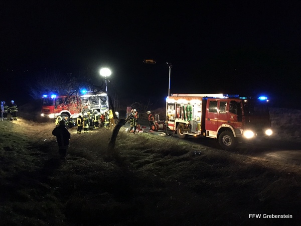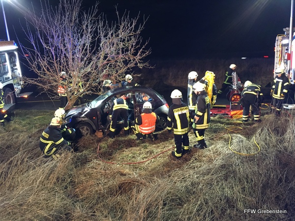 Grebenstein. Eine taghell beleuchtete Einsatzstelle und viel Blaulicht konnten Autofahrer auf der Bundesstraße 83 zwischen Grebenstein und Burguffeln auf der parallel verlaufenden ehemaligen Bundesstraße und dem jetzigen Wirtschaftsweg am Dienstagabend im Vorbeifahren sehen. Ein mit 4 Personen besetzter Kleinwagen war von der Straße abgekommen und frontal gegen einen Baum gefahren. Alle Personen wurden im PKW eingeschlossen, zwei eingeklemmt.