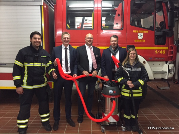 Im Rahmen eines Ortstermins am 07.11.2017 im Feuerwehrhaus der FF Grebenstein übergaben die Vertreter der SV SparkassenVersicherung Kommunal GmbH- Herr Niko Bernhardt (zuständig für die Feuerwehrförderung) und Herr Jörg Schneider (zuständiger Leiter der Geschäftsstelle der SV SparkassenVersicherung in der Stadtsparkasse Grebenstein) - jetzt den Gewinn an Herrn Sutor und für die Feuerwehr an Wehrführer Dirk Lindemann sowie die ebenfalls anwesende Jugendfeuerwehrwartin Antje Mannshausen.