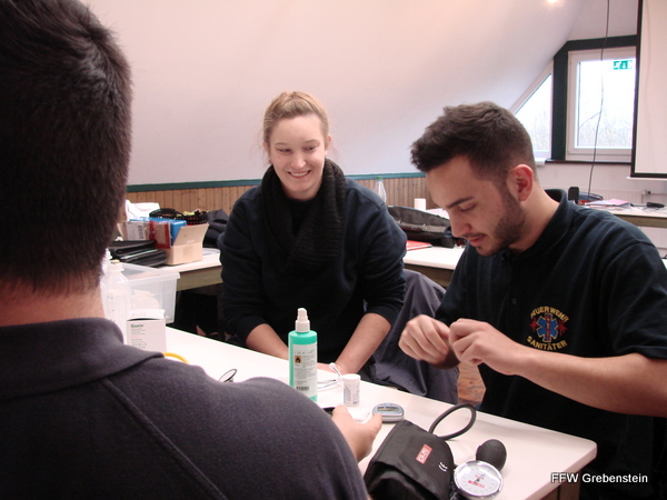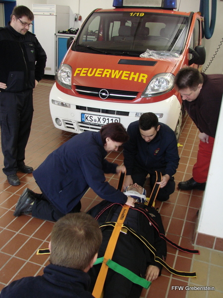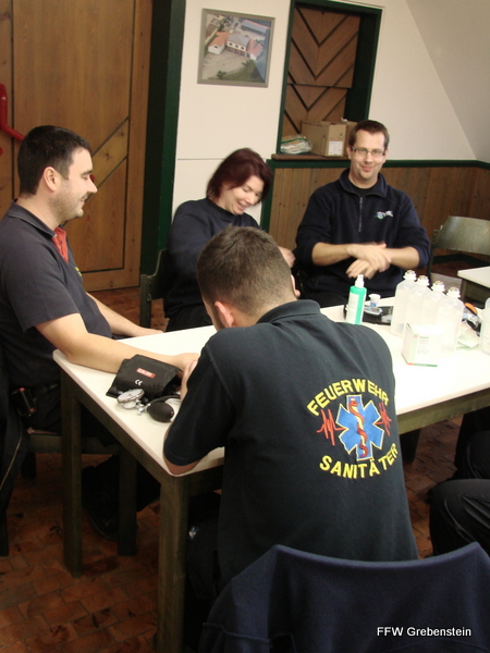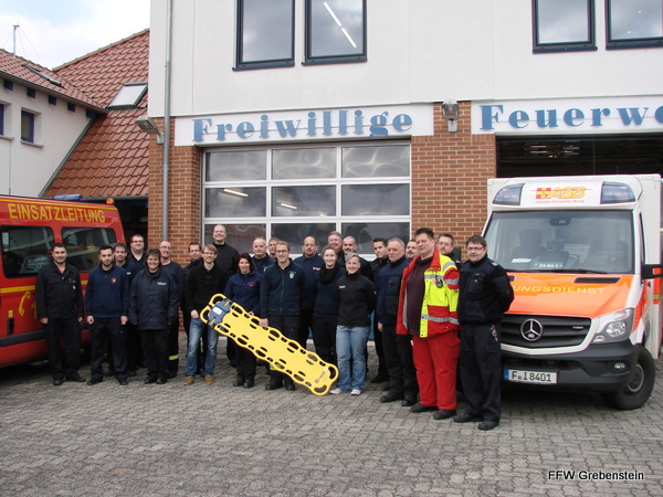 Am darauf folgenden Wochenende fand erstmal das neu organisierte Fortbildungsseminar für Feuerwehrsanitäter statt. Mit der Fortbildung wurde nach Angaben des Kreisfeuerwehrarztes insbesondere dem Umstand Rechnung getragen, dass auch freiwillige Feuerwehrkräfte seit Jahren zunehmend an der Versorgung von Notfallpatienten beteiligt sind - sei es im Rahmen der Kameradschaftshilfe, als First-Resonder (Voraushelfer), im Einsatz bzw. beim Training der Atemschutzgeräteträger oder aber einfach bei der Menschenrettung, als Tragehilfe oder im Einsatz mit der Drehleiter. Da sich auch die medizinische Ausstattung, die nicht zuletzt der Deutsche Feuerwehrverband fordert, weiter entwickelt, besteht zudem Bedarf an kontinuierlicher Fortbildung, die nunmehr regelmäßig auf Kreisebene angeboten werden soll. Unter den 24 Teilnehmern waren 2 Kameraden aus Grebenstein und 22 weitere aus dem gesamten Landkreis.