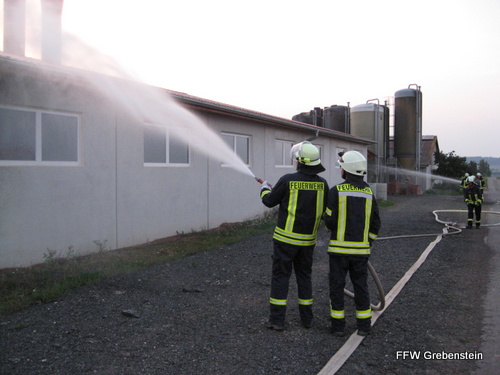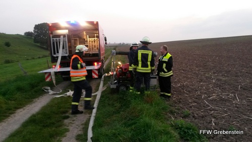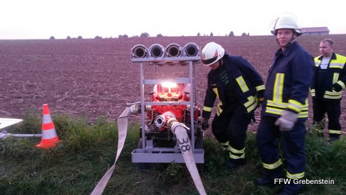 Nach kurzer Besprechung ging es um 19.30 Uhr los. Gemeinsam fuhr des KatS-Zug Grebenstein zum Burgbergteich, um von dort aus eine Wasserversorgung über eine lange Wegstrecke zu einem Schweinemastbetrieb vor Schachten aufzubauen. Die Streckenlänge betrug ca. 1300 Meter mit einem Höhenunterschied von ca. 40 Meter. Für die Strecke mussten über 90 B-Schläuche verlegt werden. Um 20.20 Uhr stand die Wasserversorgung und um 20.35 Uhr wurde Übungsende gegeben.