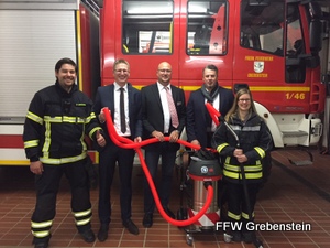 Im Rahmen eines Ortstermins am 07.11.2017 im Feuerwehrhaus der FF Grebenstein übergaben die Vertreter der SV SparkassenVersicherung Kommunal GmbH- Herr Niko Bernhardt (zuständig für die Feuerwehrförderung) und Herr Jörg Schneider (zuständiger Leiter der Geschäftsstelle der SV SparkassenVersicherung in der Stadtsparkasse Grebenstein) - jetzt den Gewinn an Herrn Sutor und für die Feuerwehr an Wehrführer Dirk Lindemann sowie die ebenfalls anwesende Jugendfeuerwehrwartin Antje Mannshausen.