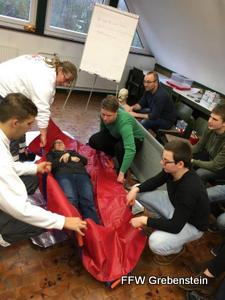 Kurz vor dem Jahreswechsel stand noch die Auffrischung der Kenntnisse in Erster Hilfe dem Dienstplan der Aktiven. Es handelt sich dabei um die Wiederholung in den entsprechenden Lehrgängen erlernten Tätigkeiten im Umgang mit Erkrankten und/oder Verunfallten.
