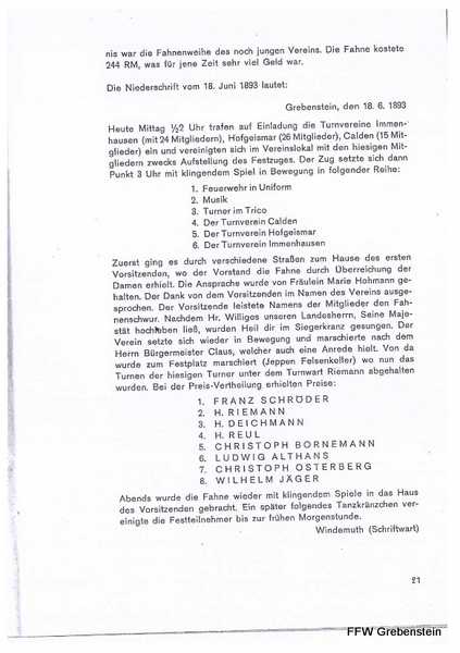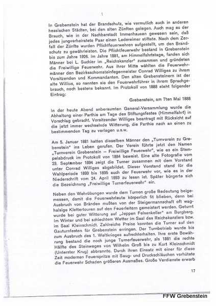 Aus der Geschichte der Freiwilligen Feuerwehr 1881 zu Grebenstein