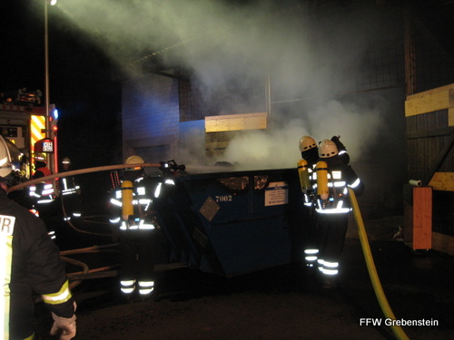 Die Feuerwehr wurde zu einen brennenden Stahlcontainer mit alten Textilien in die Bahnhofstrasse alarmiert. Beim eintreffen der Feuerwehr brannte der Inhalt des Containers bereits in voller Ausdehnung in einer Lagerhalle und drohte auf die Lagerhalle überzugreifen. Der Container wurde mit einem Mehrzweckzug aus der Lagerhalle gezogen und im freien abgelöscht. Durch den schnellen Feuerwehreinsatz konnten Schäden an der Lagerhalle verhindert werden.