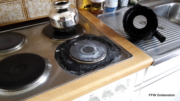 Die Feuerwehr wurde zu einem Gebäudebrand in die Lessingstrasse in Grebenstein alarmiert. Eine auf dem angeschalteten Herd vergessenen Plastikkanne begann zu brennen und die Wohnung wurde mit Rauchgasen verqualmt. Beim Eintreffen der Feuerwehr befanden sich die Hausbewohner bereits ausserhalb des Gebäudes und die Plastikkanne war von der Herdplatte bereits entfernt worden. Unter Atemschutz wurden die Sicherungen vom Elektroherd gezogen und die Türen und Fenster der Wohnung geöffnet. Anschließend wurde die Wohnung mit einem Druckbelüfter von den Rauchgasen befreit.