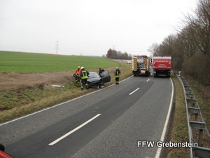 Die Feuerwehr wurde zu einem Verkehrsunfall auf der Kreisstrasse zwischen Grebenstein und Immenhausen alarmiert. Einen Personenkraftwagen war aus Richtung Immenhausen kommend in der Nähe vom "Klingenhof" von der Fahrbahn abgekommen und über einen Wassergraben in eine Landwirtschaftsfläche geflogen und dort zum stehen gekommen. Beim Eintreffen der Feuerwehr wurden die Insassen des Personenkraftwagens bereits außerhalb des Fahrzeuges vom Rettungsdienst versorgt. Da auch keine Betriebsstoffe ausgelaufen waren, konnte die Feuerwehr nach kurzer Zeit an der Einsatzstelle wieder einrücken.