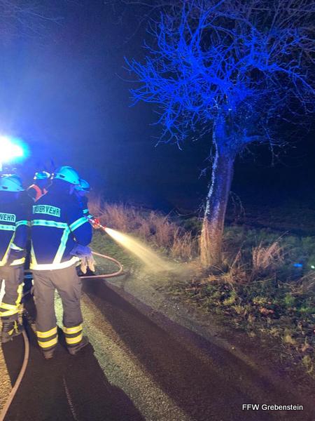 Die Feuerwehr wurde zu einem brennenden Baum auf einen Wirtschaftsweg zwischen Grebenstein und Kelze alarmiert. Aufgrund der nicht genauen Ortsangabe musste die Einsatzstelle zwischen Grebenstein und Kelze erst gesucht werden.Nach Auffinden des brennenden Baumes konnte dieser in kürzester Zeit gelöscht werden.