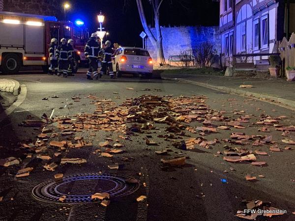 Dabei wurde auch ein unbesetzter PKW beschädigt. Weiterhin war ein Baum auf einen Wirtschaftsweg gestürzt und blockierte diesen. Verletzt wurde niemand. Die Feuerwehr stelle zunächst Einsatzbereitschaft her und arbeitete die Einsatzstellen dann ab. Da bei den Häusern die Gefahr bestand, dass weitere Ziegeln herabstürzen könnten wurden die betroffenen Stellen großräumig abgesperrt. Der Baum wurde vom Weg entfernt.
