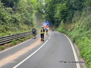 Die Feuerwehr Grebenstein wurde zu einer Ölspur auf die Kreisstrasse 51 Richtung Udenhausen alarmiert. In der Nähe der Bahnbrücke war es zu auslaufenden Betriebsstoffen auf der Gefällstrecke gekommen.