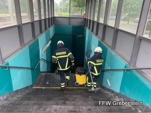 Die Feuerwehr Grebenstein wurde zum Bahnhof in Grebenstein alarmiert. Nach starken Regen stand die Bahnunterführung zwischen den Gleisen unter Wasser. Durch die Feuerwehr wurde das Wasser aus der Bahnunterführung entfernt.
