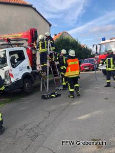 Die Feuerwehr Grebenstein wurde zur Unterstützung der Feuerwehr Udenhausen zu einer umstürzenden Arbeitsbühne nach Udenhausen in den Triftweg alarmiert. Bei Arbeiten an einer Giebelwand drohte eine mit Personen besetzte Arbeitsbühne umzukippen. Die Arbeitsbühne wurde gesichert und die Personen mit der Drehleiter der Feuerwehr Hofgeismar gerettet. Nach der Rettung der Personen wurde die Arbeitsbühne eingefahren und das Trägerfahrzeug der Bühne wieder aufgestellt.