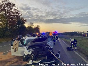 Die Feuerwehr Grebenstein wurde zusammen mit der Feuerwehr Burguffeln zu einem Verkehrsunfall auf der Bundesstrasse 83 alarmiert. Gemeldet war ein Verkehrsunfall mit 2 PKW und 3 in den Fahrzeugen eingeklemmte Personen. Glücklicherweise waren beim Eintreffen der Feuerwehren bereits alle Personen aus den Fahrzeugen und wurden mit leichten Verletzungen durch den Rettungsdienst betreut. Durch die Feuerwehren erfolgte eine Absicherung der Einsatzstelle und die Aufnamhe ausgelaufener Betriebsstoffe. Für die Rekontruktion des Unfallherganges wurde in den Abendstunden noch die Unfallstelle ausgeleuchtet.