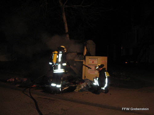 | 09. Januar 2008 | Altkleider-Container Brand Alarmierungszeit: 05:23 Einsatzdauer: 0:27 Einsatzstärke: 12 |