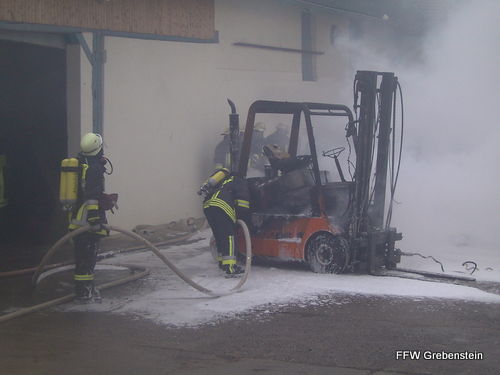 Gabelstaplerbrand in Lagerhalle Alarmierungszeit: 07:49 Einsatzdauer: 1:06 Einsatzstärke: 18 Zuerst erfolgte der Versuch durch den Besitzer, den brennenden Gabelstapler mit mehreren Pulverlöschern zu löschen. Der Brand konnte dadurch aber nicht gelöscht werden.