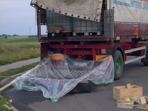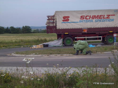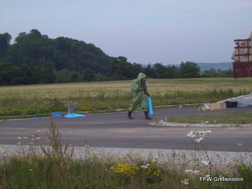 Gefahrstoffübung Alarmierungszeit: 19:55 Einsatzdauer: 2:05 Einsatzstärke: 23 Alarmübung der Grebensteiner Feuerwehren mit Unterstützung der Feuerwehr Hofgeismar. Angenommene Schadenslage war eine aus einem LKW-Anhänger auslaufende unbekannte Flüssigkeit. |