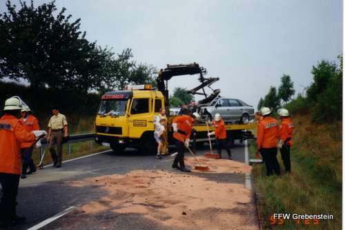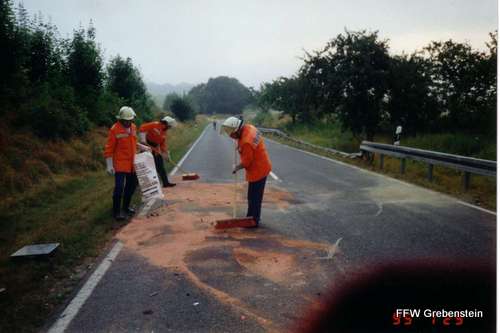 | 27. Mai 1995 | Ausgelaufenes Hydrauliköl Lastkraftwagen Alarmierungszeit: 07:00 Einsatzdauer: 0:45 Einsatzstärke: 9 |