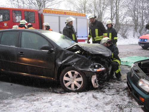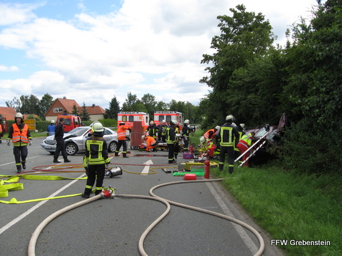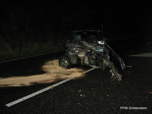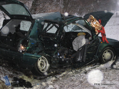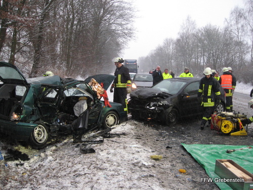 Verkehrsunfall Bundesstrasse 83 bei FrankenhausenAlarmierungszeit: 16:37 UhrEinsatzdauer: 2:38Einsatzstärke: 18Beim Frontalzusammenstoß von zwei Personenkraftwagen wurde eine Person in Ihrem PKW eingeklemmt und durch die Feuerwehr befreit. Durch die Feuerwehr wurde die Einsatzstelle abgesichert und später für eine Unfallrekonstruktion ausgeleuchtet. Bei dem Unfall verstarb eine Person an der Unfallstelle und zwei weitere wurden schwer verletzt. Die Bundestrasse war während der Rettungsarbeiten voll gesperrt. |