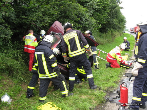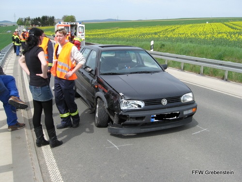 Verkehrsunfall Bundesstrasse 83 zwischen Abfahrt GrebensteinS üd und BurguffelnAlarmierungszeit: 12:43 UhrEinsatzdauer: 0:37Einsatzstärke: 10Nach einem Alleinunfall eines Personenkraftwagen, der im Graben neben der Fahrbahn landete, wurde die Einsatzstelle abgesichert und der Rettungsdienst bei der Rettung der verletzten Person aus dem PKW unterstützt. Die Heckklappe des PKW wurde mit hydraulischen Rettungsgerät entfernt und die Person mit einen Rettungsbrett aus dem Fahrzeug getragen. |