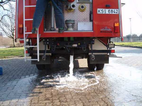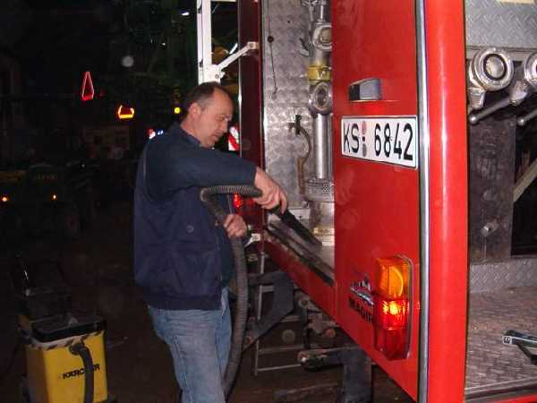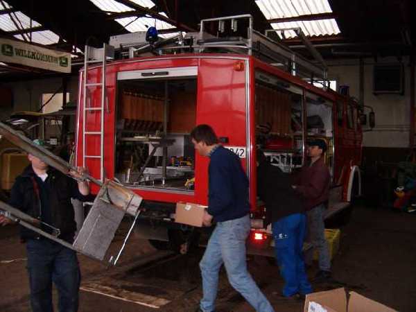 Nach einer intensiven Planungsphase wurde am 22.03.04 mit den Umbaumaßnahmen begonnen. Zuerst wurde der Fahrzeugaufbau ausgeräumt, um Platz für den 1250 Liter Wassertank zu schaffen. An Stelle der Tragkraftspritze, die auf den Gerätewagen Nachschub untergebracht wurde, wurde im hinteren Geräteraum der Tank eingebaut.